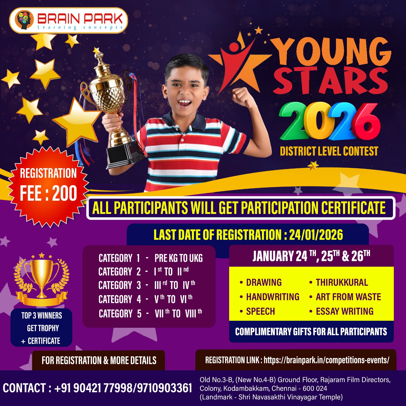 Competition Select CompetitionDrawingArts & CraftVocal MusicSilambamFancy DressMusic InstrumentsRubik CubesActingDanceThirukuralKarateUnique TalentsSpeechRhymes / Poem RecitationScience ExperimentsYoga